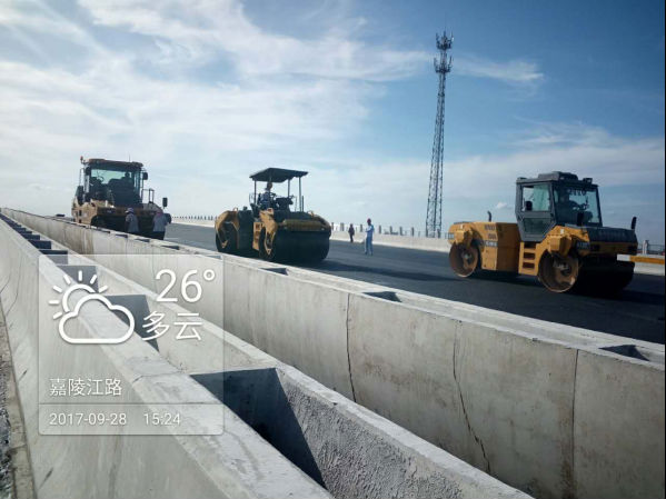 洋口運河大橋接線工程:完成機動、非機動車道兩側路緣石平側石鋪設1080米,人行道鋪設路面磚1712m2,完成機動車道上面層瀝青攤鋪35343.4m2,完成輔橋下面層瀝青攤鋪3312m2。